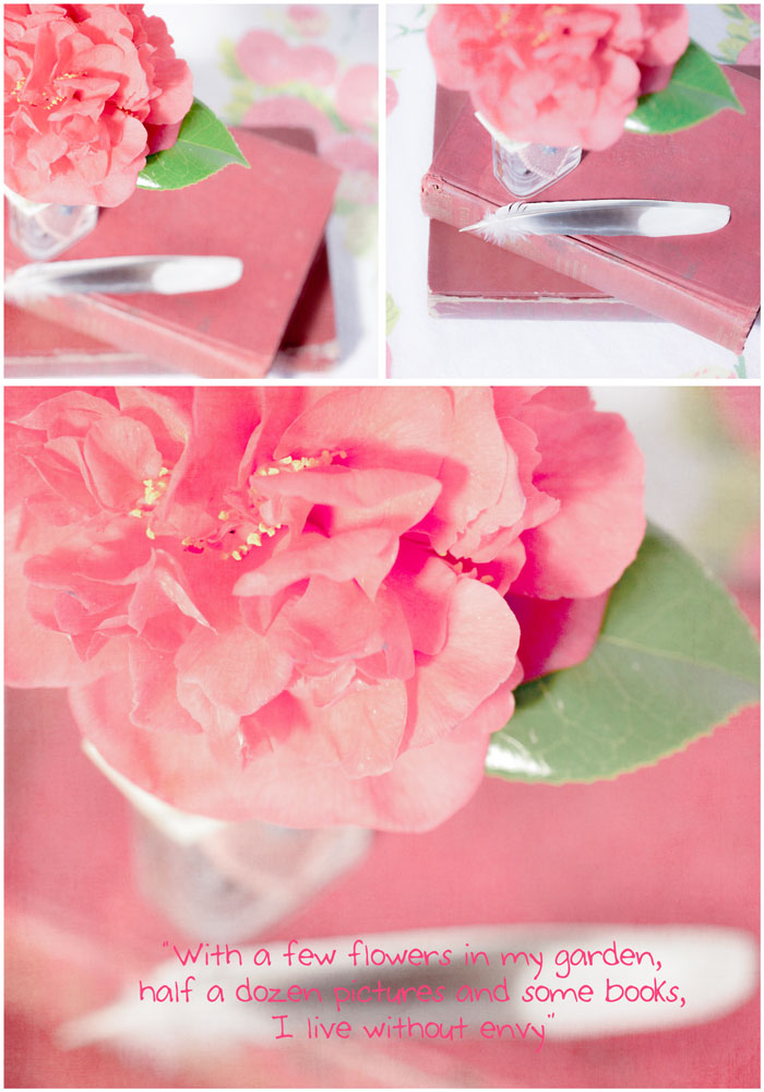 I decided to use one of the few flowers blooming in my yard right now, a camellia, for this photo. I have this Valentine-looking bottle and also used two of my vintage books. I found the mourning dove feather in my yard the other day. I have so much to learn about using my camera, but am enjoying both BL and 2B! I also upgraded to Lightroom 4 and am just starting to find out about this great software. Signed up for Kim’s Lightroom class; it starts when I will still be on vacation (Maui, I know, no one will feel sorry for me!), but I am going to do my best with all 3 classes!! :)