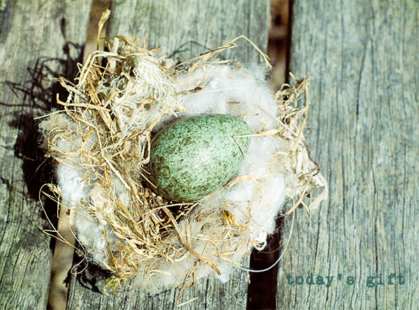 I noticed my dog about to eat something back by the redwood trees in my backyard and ran to him in case it was something that would make him sick. I found this beautiful bird egg (I am guessing a crow’s, since I think they have a nest up above). It had a little hole in it and was empty, but otherwise still perfectly formed. I just had to fetch an old nest I had found and kept and take some photos of the egg. That was today’s gift photo opportunity!