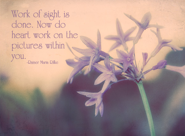 Heart Work… June 25, 2013 ~ sherresartzone This quote by Rainer Maria Rilke struck a chord with me for this is exactly what we do as photographers who like to use Photoshop and other tools to edit our photos to speak our hearts. Share this: Share on X (Opens in new window) X Share on Facebook (Opens in new window) Facebook Like Loading... Related