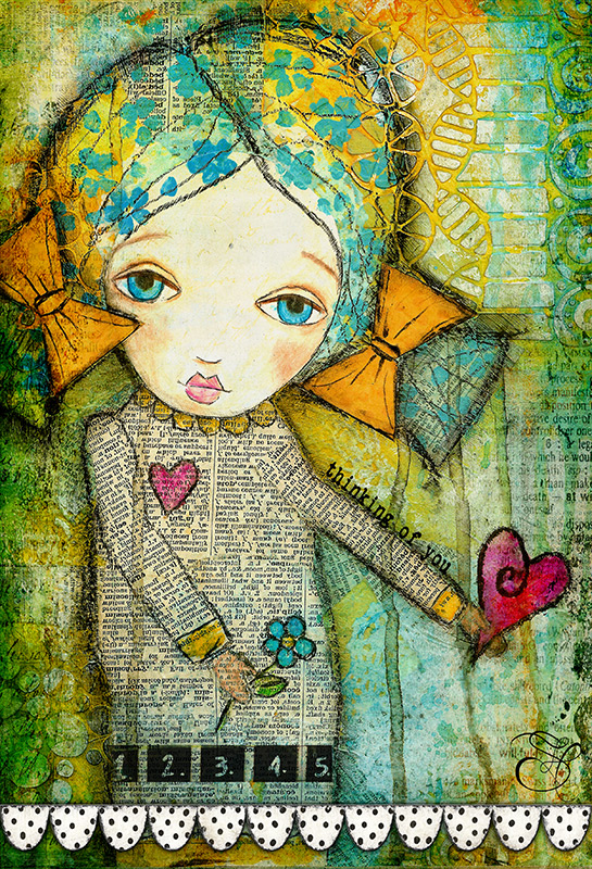 Thinking of You… March 28, 2014 ~ sherresartzone I created this piece in my studio using a SuziBlu-inspired face. After I finished painting this collage, I scanned it and then added a few textures and elements from deviantscrap.com. I also used a Kim Klassen texture from her Downton II collection. Share this: Click to share on X (Opens in new window) X Click to share on Facebook (Opens in new window) Facebook Like Loading... Related