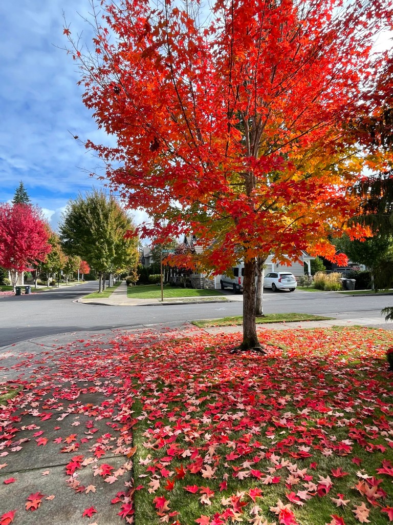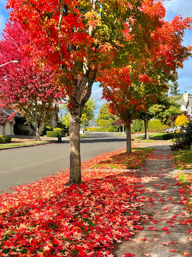 Neighborhood Fall Color October 17, 2021October 17, 2021 ~ sherresartzone One of my favorite times of the year to go for our daily walk. The trees are just glorious ranging from reds to oranges to yellows to rusts- and when seen against a bright blue sky- beautiful! Share this: Click to share on X (Opens in new window) X Click to share on Facebook (Opens in new window) Facebook Like Loading... Related