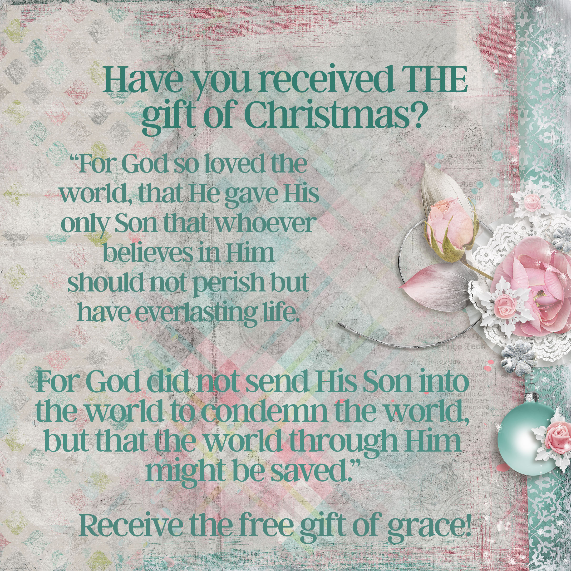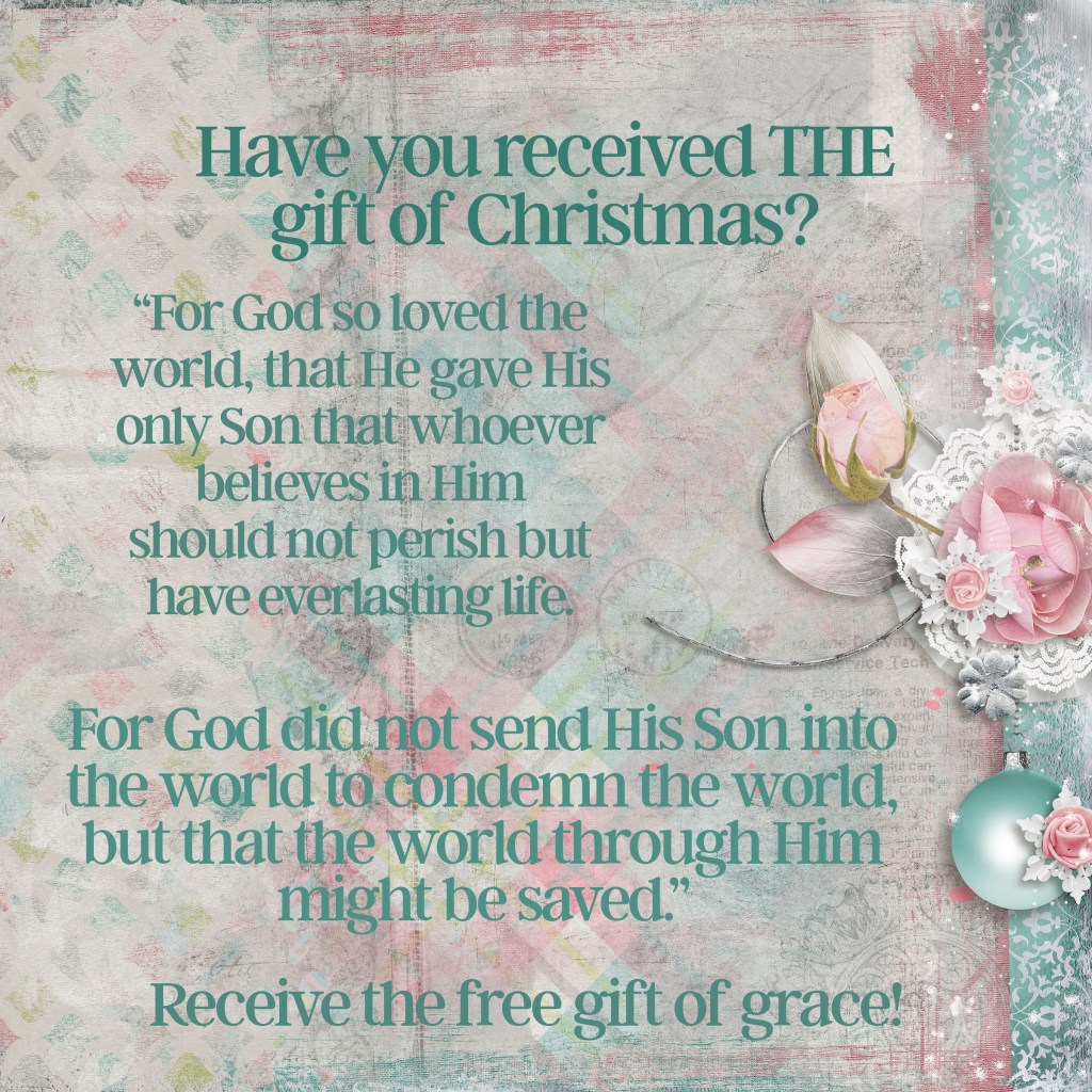 Daily Graces Return #626 December 20, 2021 ~ sherresartzone John 3:16,17. Share this: Click to share on X (Opens in new window) X Click to share on Facebook (Opens in new window) Facebook Like Loading... Related
