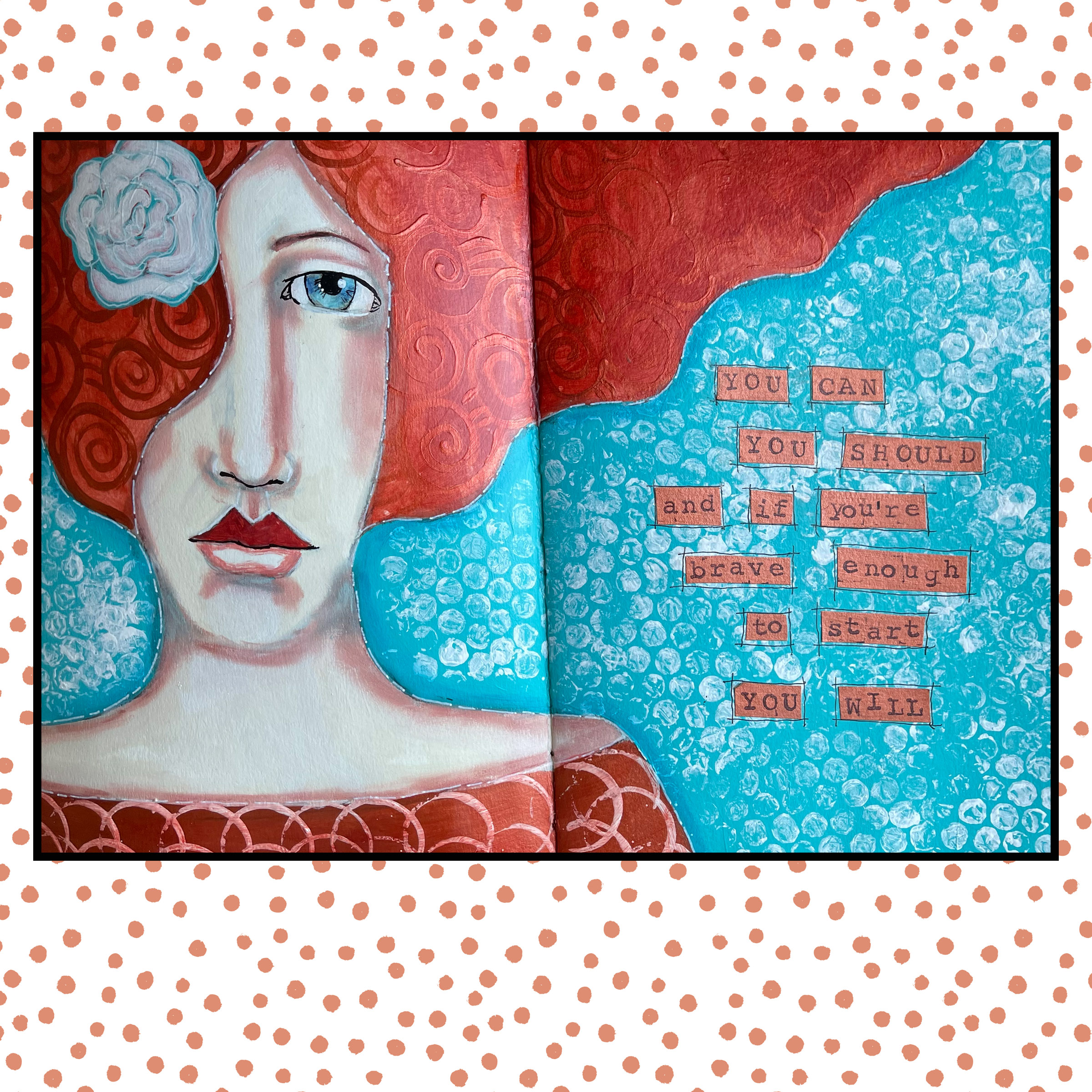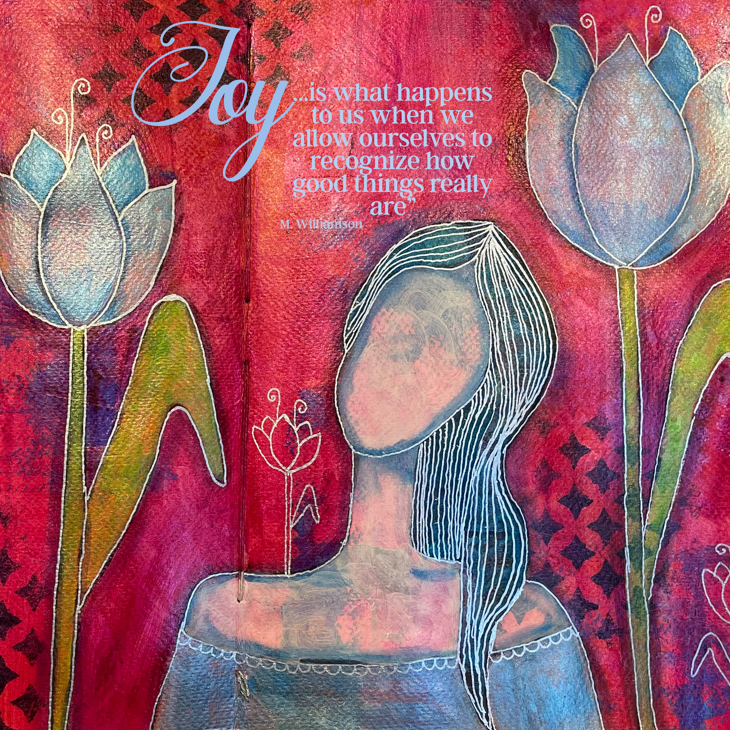 I have been enjoying creating in journals this year so much. The photo of this spread was taken before I had fully finished the piece. Inspired by Effy Wild’s May lesson for Book of Days 2021.