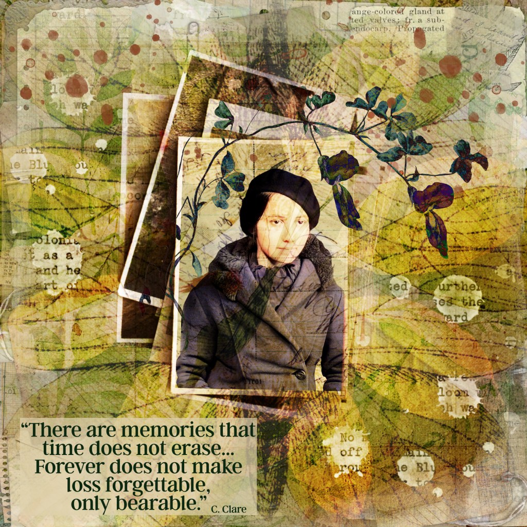 Some new graphics that I bought from Gracie Tracy make up this montage. I was thinking of memories and gratitude since it is Thanksgiving week. Good memories are a blessing to be grateful for! The image is from the graphics collection as well, no relation to me.