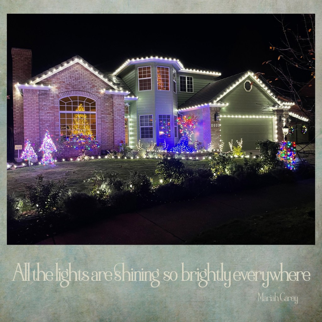 My husband loves Christmas lights so this is this year’s version. There are a few lighted trees to the left that didn’t fit into the shot but you get the idea. Celebrating the coming of the Light of the world.