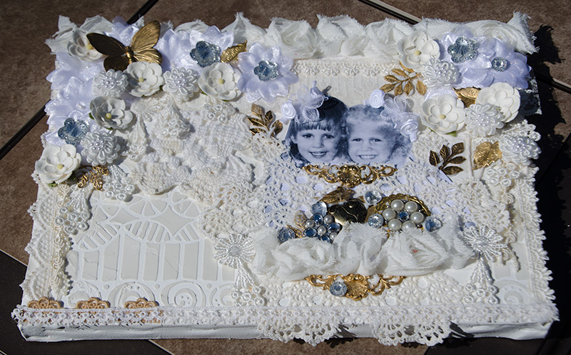 Beginning phase and finished phase of my Life Book Week 12 project. I chose to use an old photo of my daughter Ami with her cousin Caty (who recently passed away). This life moment was captured at my sister-in-law Pam’s wedding. Our theme for this month is “connections” and so I thought this photo was appropriate. Plus, it is an adorable photo of the two of them!