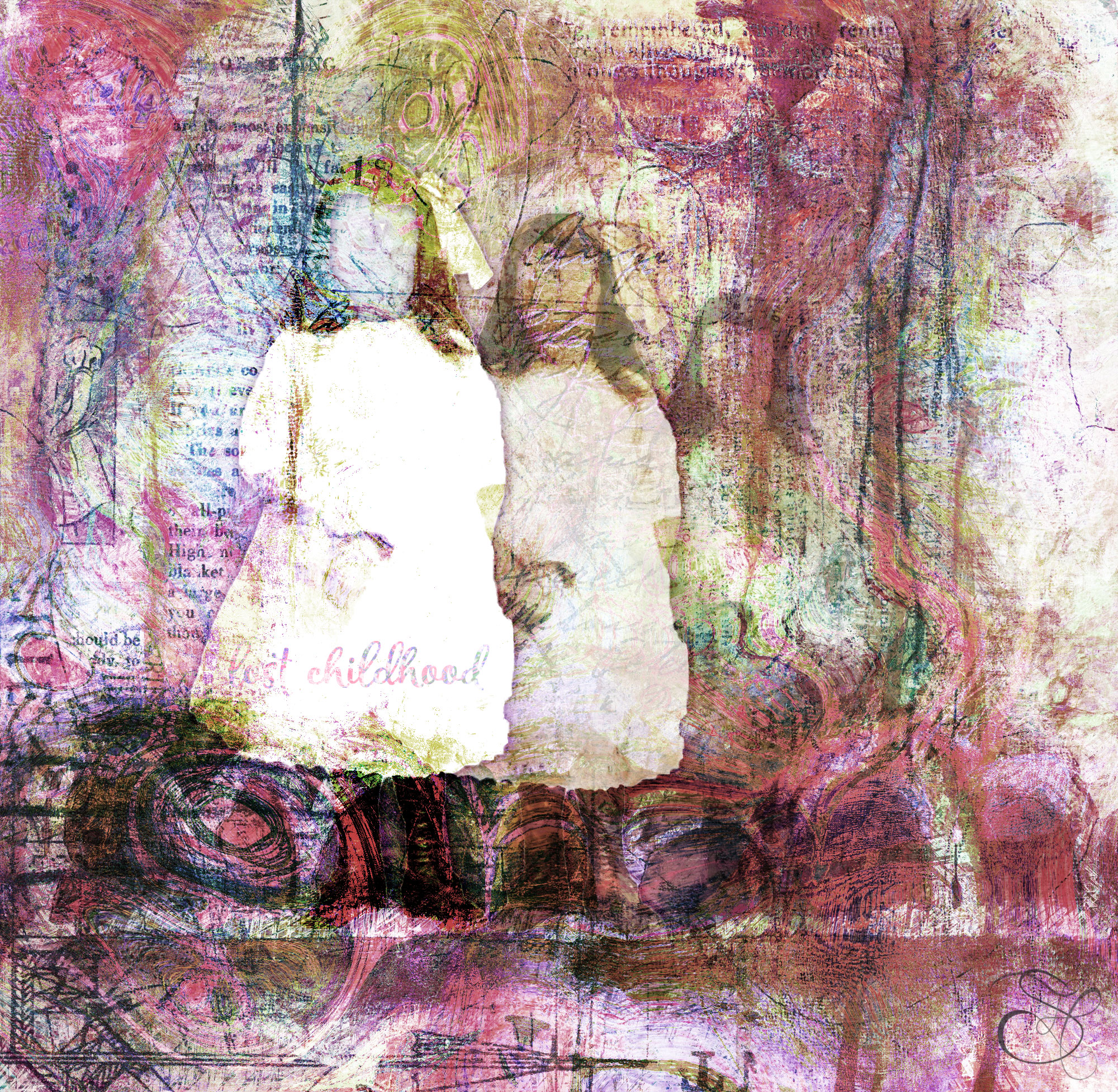 I began this piece with a hand painted collage which led to some serious thinking on how so many children in today’s world have to grow up so quickly, thus losing their childhood so to speak. I love how during the creative process what starts out as a lighthearted piece can become fraught with hidden meaning.