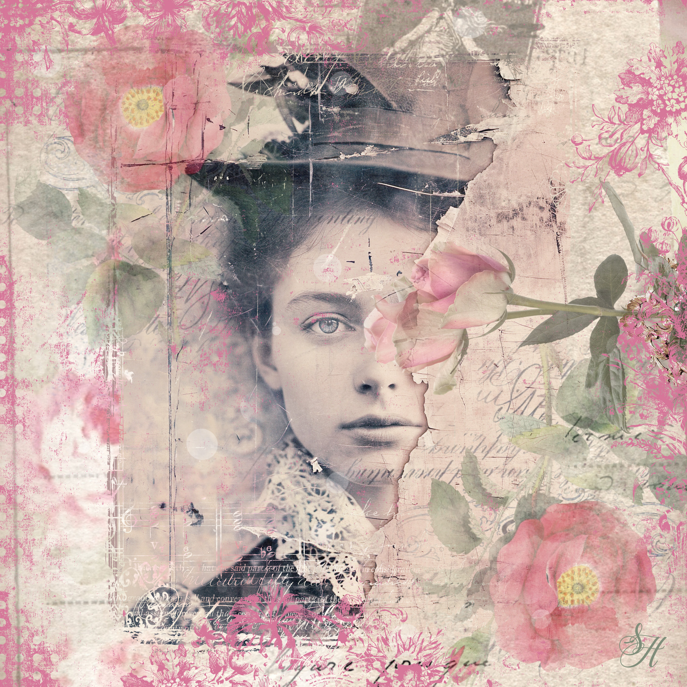 The art is from a work in progress for Ivy Ivette Newport‘s August Studioworks lesson wherein we were to create a self-portrait using collage. The background is the first layer that I photographed which was done with graphite with my non-dominant hand using the photo taken that I used as the main image in the collage. The smaller inset is from the work in progress meaning I am not done with it yet. I photographed my piece and then brought it into Photoshop where I played with quite a few different filters from Filter Forge. This filter is called Freehand Hatch 1. As an older woman it is always a challenge to want to work with one’s own image. Unexpectedly found this an interesting process even so.