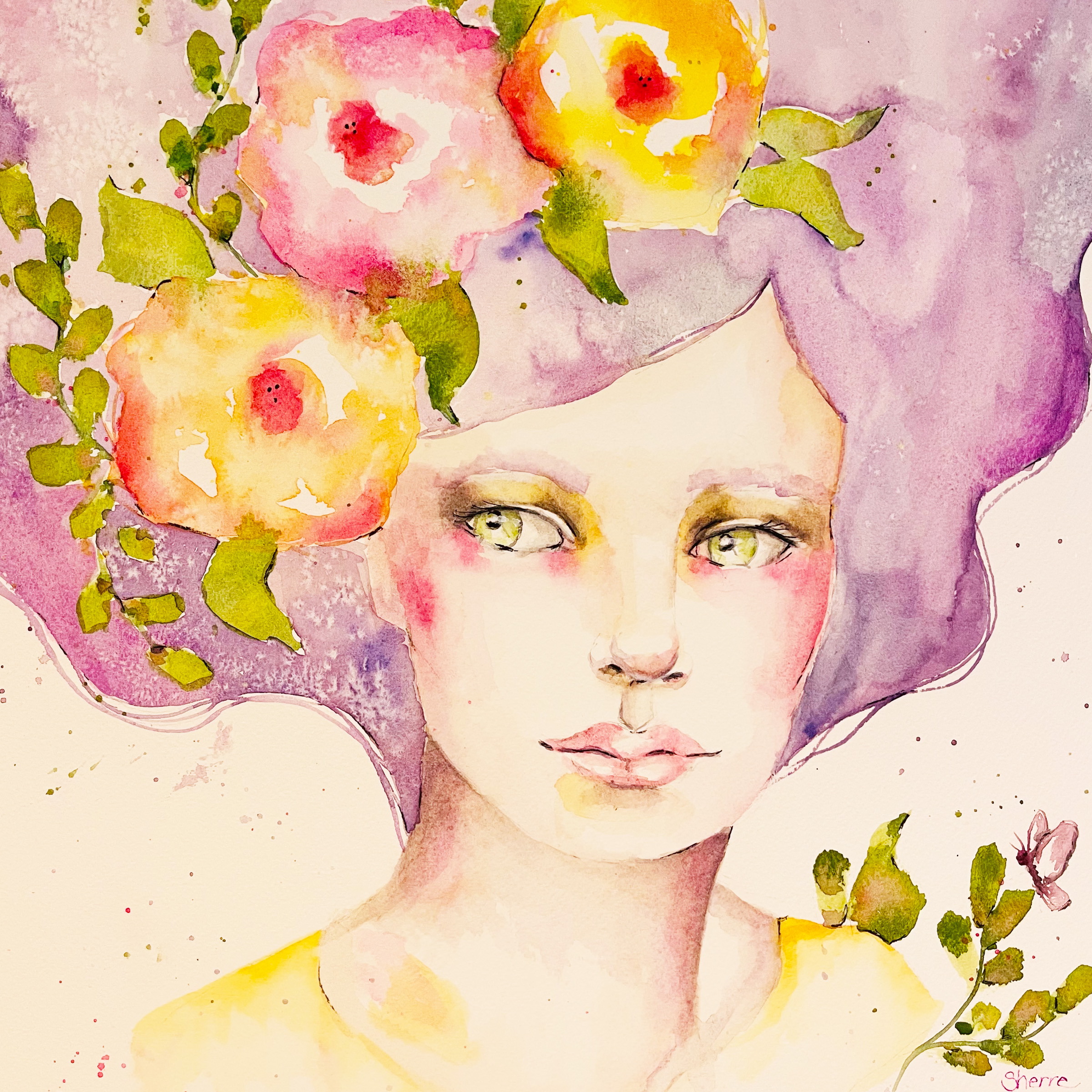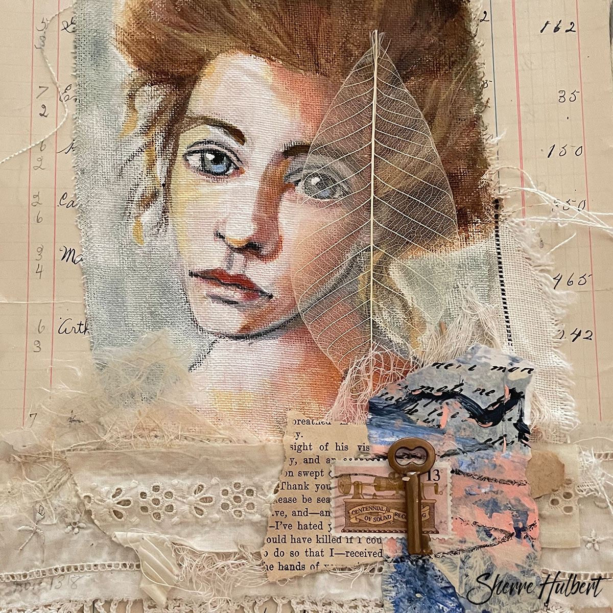 Inspired by Lesson 3 from A Veil of Wax class taught by Ivette Newport. The wax is till a bit cloudy in this photo but couldn’t wait to share her. I drew and painted her on a piece of watercolor board. I used Daniel Smith watercolor paints, charcoal pencil, colored pencil, white water-soluble oil paint, and encaustic wax; plus a little bling! I love this piece!
