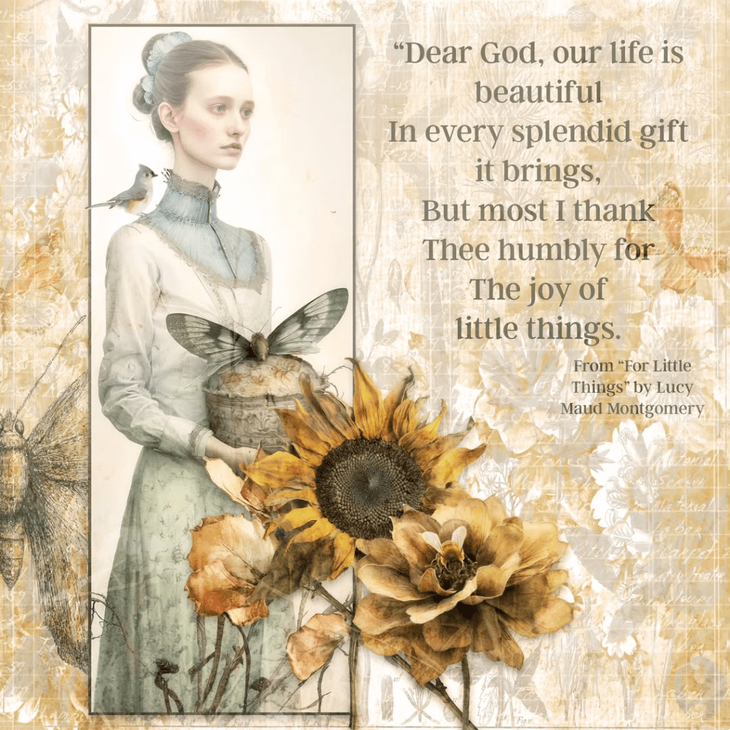 Lucy Maud Montgomery also wrote many poems in her lifetime as well as her beloved books like Anne of Green Gables. This is the last verse from a sweet poem she wrote titled, “For Little Things.”
